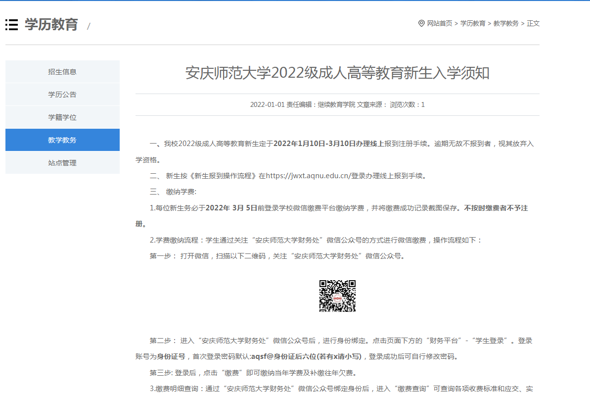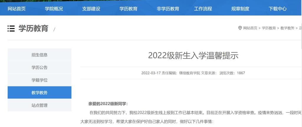 二是多渠道服务新生,开展线上入学教育。通过学校官网发布温馨提示、建班级QQ群、发送协同短信等多种方式让学生充分了解报到流程、缴费方式、入学教育内容、人才培养方案和课程教材目录等事项,使新同学尽快知晓高等学历继续教育学籍、学习、考试、学历、学位方面的管理要求,按照要求安排好学习。
